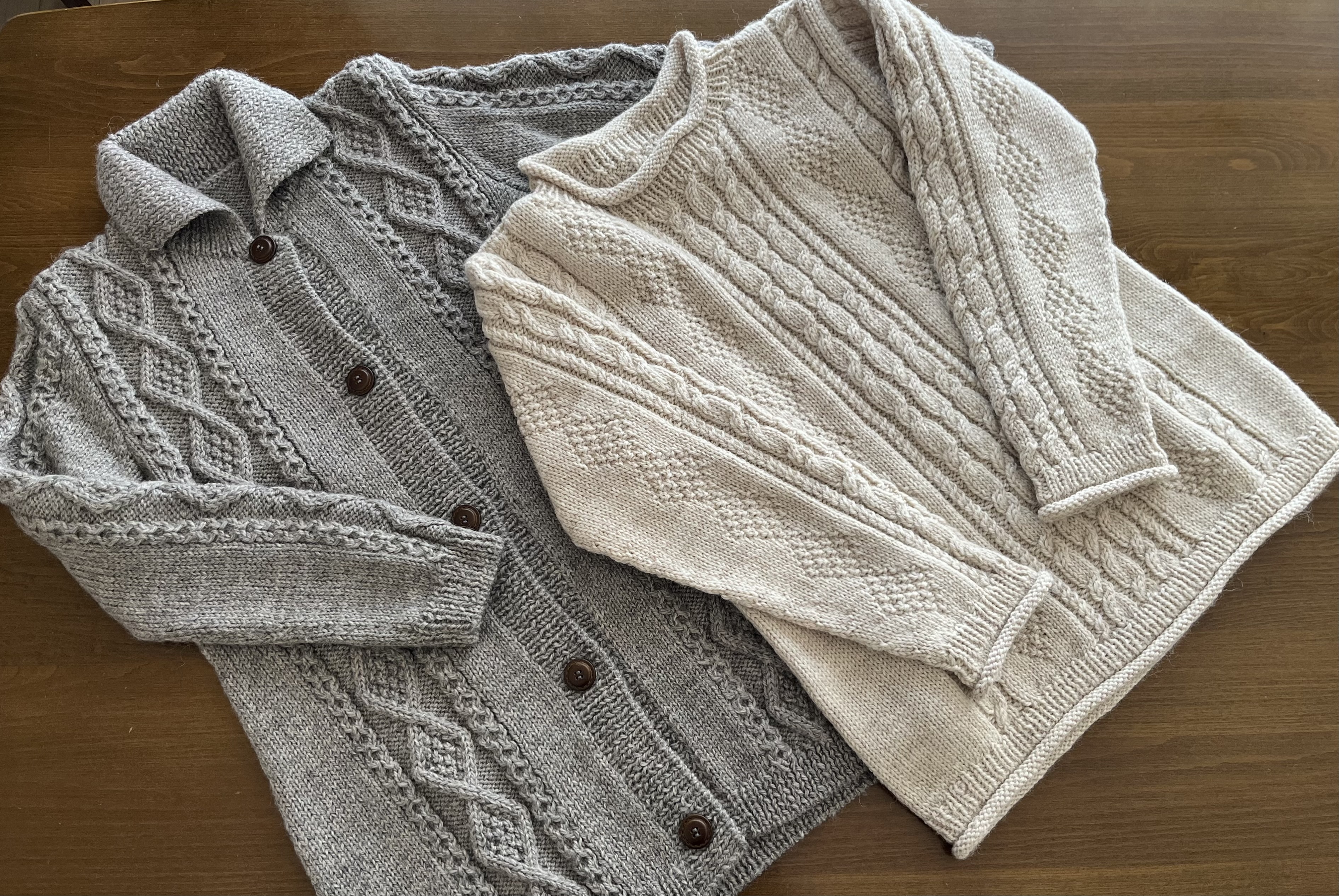 写真のセーターは10年以上前に、暇を見つけてコツコツ編んだものですが、まだ現役で活躍してます。